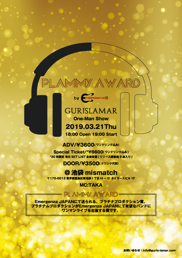 第1弾として、昨年行われた世界最大のバンドコンテスト、”Emergenza JAPAN" にて、プラチナムプロダクション賞を受賞したバンド「Gurislamar」とのタイアップが、3/21のワンマンライブで実現します!